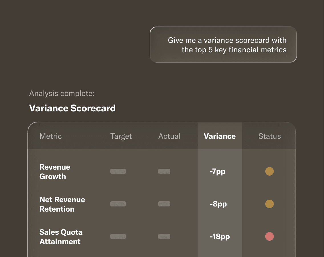 Investigate any variance instantly. Ask 'Why did revenue drop?' or 'What's driving the cost spike?'. Answers delivered with context and citations. No waiting for analysts.
